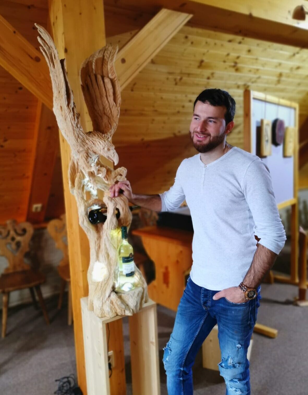 V roku 2017 som sa vrhol na živnosť ako tesár a kúzlil som drevo do rôznych foriem umenia. Vytvoril som stojany na víno, sochy anjelov, ďalej mnícha, orly, sovy, vlky, levy, medvede a ďalšie sochy v životnej veľkosti, a dokonca i filmové postavičky ako Groot! Vo svojej práci sa venujem krovom, obkladom, prístreškom, saunám, nadstrešeniam, altánkom a ďalším dreveným výtvorom.